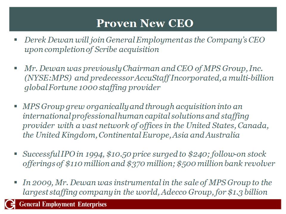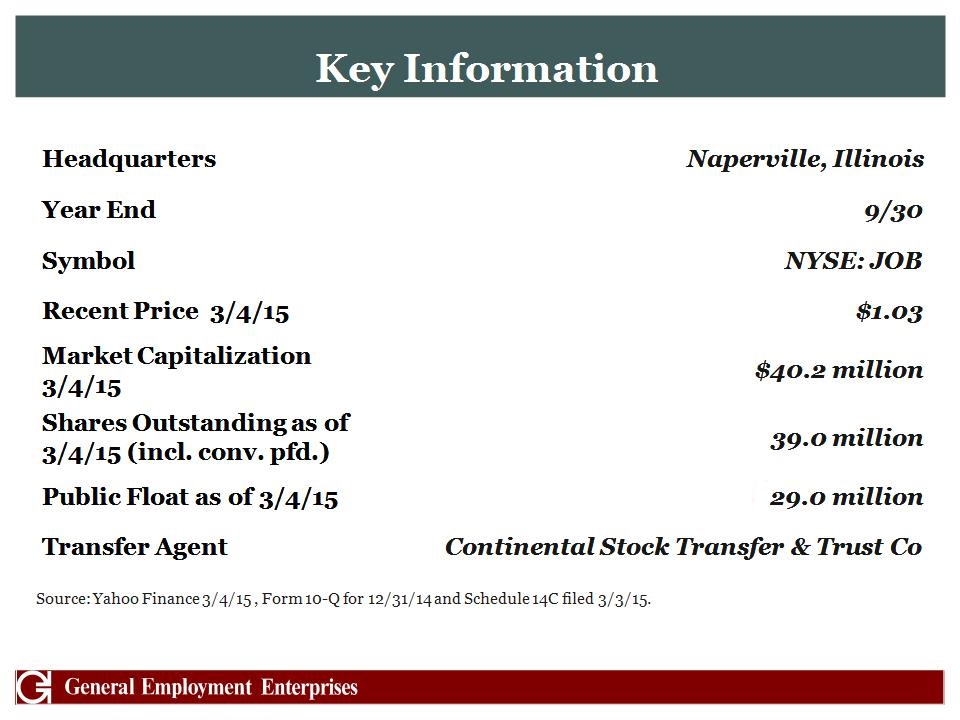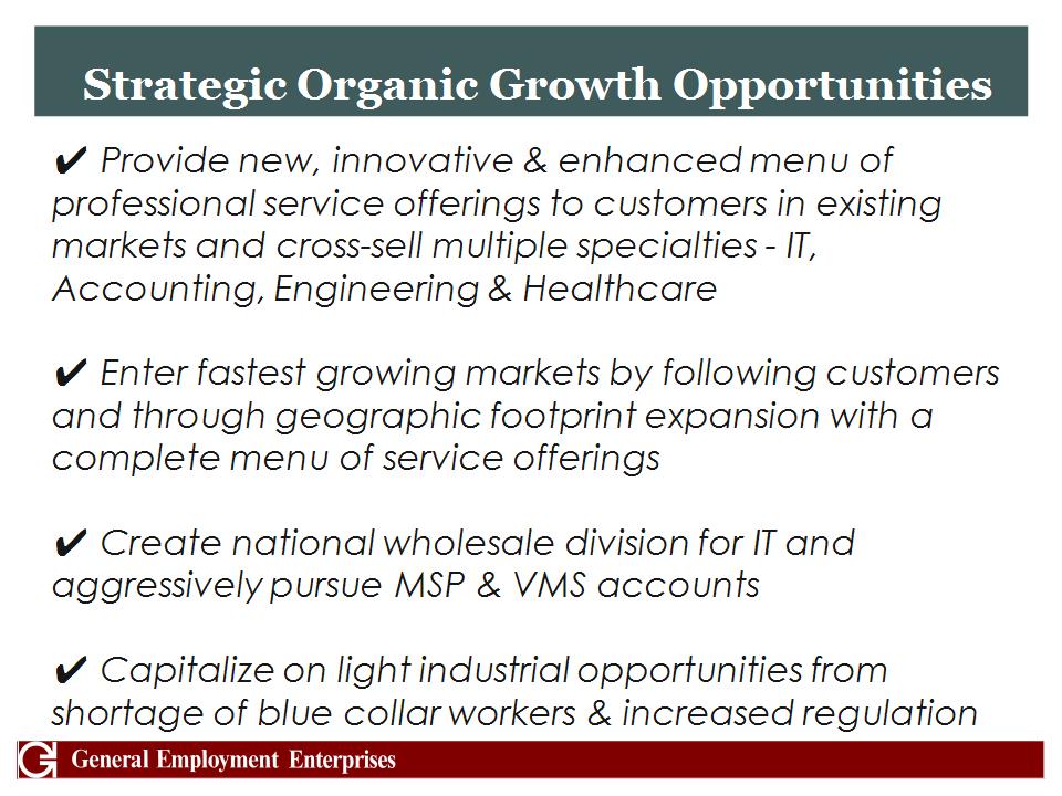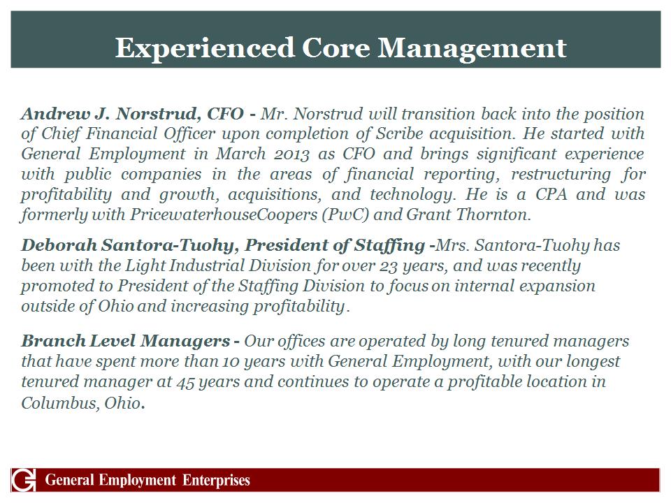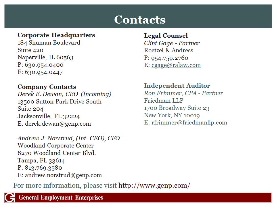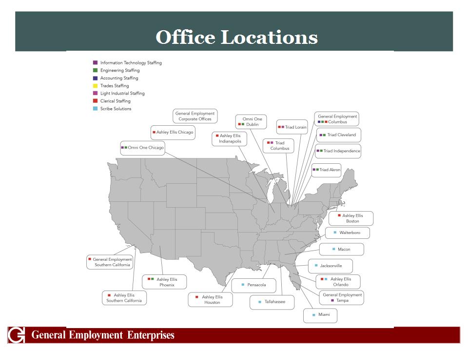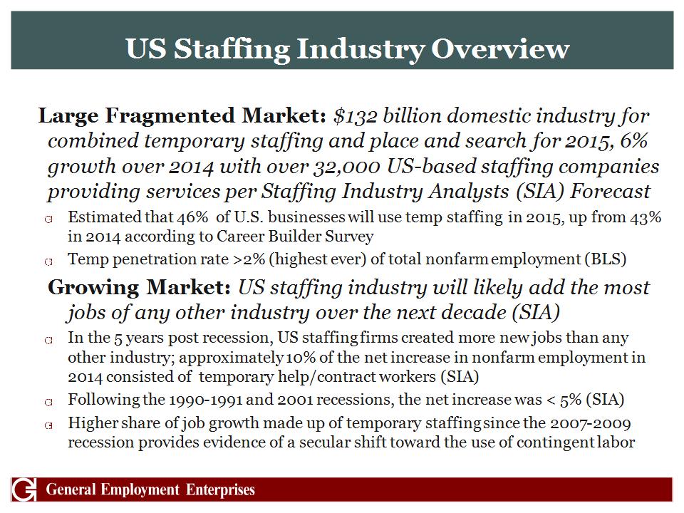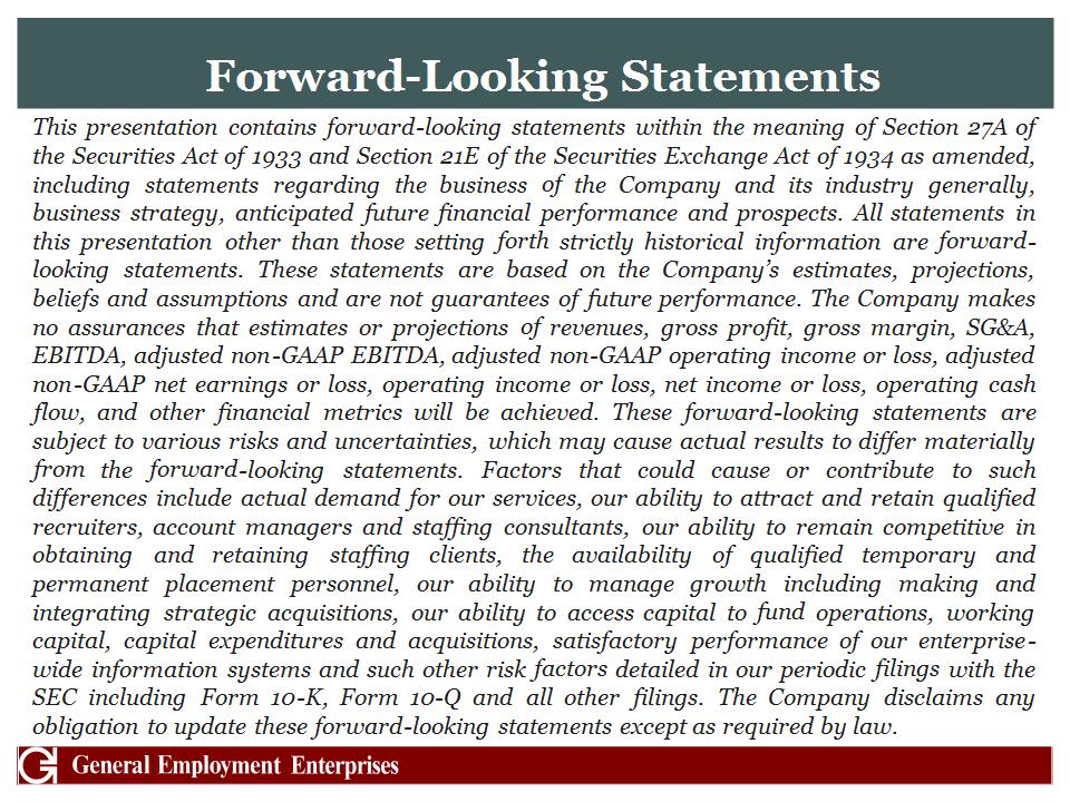 Forward-Looking Statements This presentation contains forward-looking statements within the meaning of Section 27A of the Securities Act of 1933 and Section 21E of the Securities Exchange Act of 1934 as amended, including statements regarding the business of the Company and its industry generally, business strategy, anticipated future financial performance and prospects. All statements in this presentation other than those setting forth strictly historical information are forward-looking statements. These statements are based on the Company’s estimates, projections, beliefs and assumptions and are not guarantees of future performance. The Company makes no assurances that estimates or projections of revenues, gross profit, gross margin, SG&A, EBITDA, adjusted non-GAAP EBITDA, adjusted non-GAAP operating income or loss, adjusted non-GAAP net earnings or loss, operating income or loss, net income or loss, operating cash flow, and other financial metrics will be achieved. These forward-looking statements are subject to various risks and uncertainties, which may cause actual results to differ materially from the forward-looking statements. Factors that could cause or contribute to such differences include actual demand for our services, our ability to attract and retain qualified recruiters, account managers and staffing consultants, our ability to remain competitive in obtaining and retaining staffing clients, the availability of qualified temporary and permanent placement personnel, our ability to manage growth including making and integrating strategic acquisitions, our ability to access capital to fund operations, working capital, capital expenditures and acquisitions, satisfactory performance of our enterprise-wide information systems and such other risk factors detailed in our periodic filings with the SEC including Form 10-K, Form 10-Q and all other filings. The Company disclaims any obligation to update these forward-looking statements except as required by law.