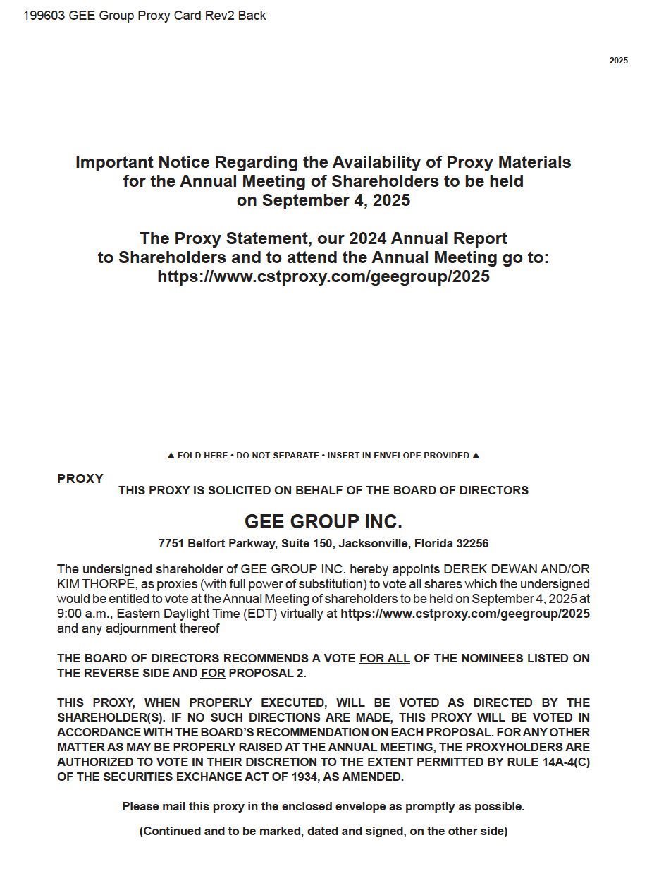Notice is hereby given that the 2025 Annual Meeting of Shareholders (the “Annual Meeting”) of GEE Group Inc. (the “Company”), will be held at 9:00 a.m., Eastern Daylight Time (EDT) on September 4, 2025, in a virtual meeting format at https://www.cstproxy.com/geegroup/2025. Shareholders will NOT be able to attend the Annual Meeting in-person. The accompanying Proxy Statement includes instruction on how to access the virtual Annual Meeting and how to listen, vote, and submit questions from home or any remote location with Internet connectivity. At the Annual Meeting, the Company will consider and vote upon the following items: