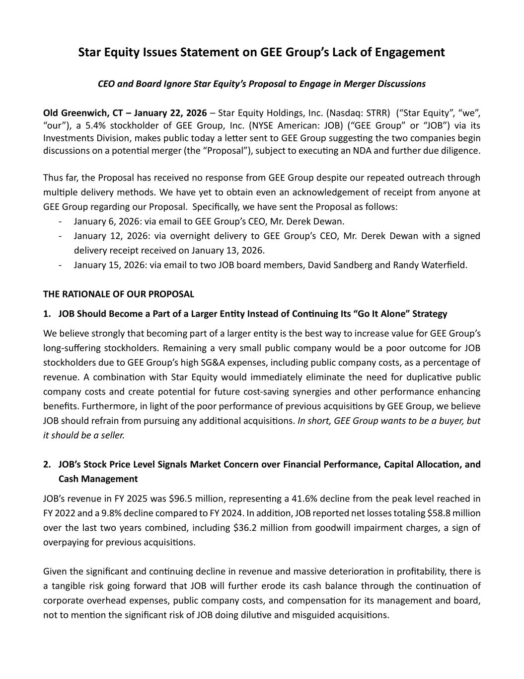 Star Equity Issues Statement on GEE Group’s Lack of Engagement CEO and Board Ignore Star Equity’s Proposal to Engage in Merger Discussions Old Greenwich, CT – January 22, 2026 – Star Equity Holdings, Inc. (Nasdaq: STRR) (“Star Equity”, “we”, “our”), a 5.4% stockholder of GEE Group, Inc. (NYSE American: JOB) (“GEE Group” or “JOB”) via its Investments Division, makes public today a leƩer sent to GEE Group suggesƟng the two companies begin discussions on a potenƟal merger (the “Proposal”), subject to execuƟng an NDA and further due diligence. Thus far, the Proposal has received no response from GEE Group despite our repeated outreach through mulƟple delivery methods. We have yet to obtain even an acknowledgement of receipt from anyone at GEE Group regarding our Proposal. Specifically, we have sent the Proposal as follows: - January 6, 2026: via email to GEE Group’s CEO, Mr. Derek Dewan. - January 12, 2026: via overnight delivery to GEE Group’s CEO, Mr. Derek Dewan with a signed delivery receipt received on January 13, 2026. - January 15, 2026: via email to two JOB board members, David Sandberg and Randy Waterfield. THE RATIONALE OF OUR PROPOSAL 1. JOB Should Become a Part of a Larger EnƟty Instead of ConƟnuing Its “Go It Alone” Strategy We believe strongly that becoming part of a larger enƟty is the best way to increase value for GEE Group’s long-suffering stockholders. Remaining a very small public company would be a poor outcome for JOB stockholders due to GEE Group’s high SG&A expenses, including public company costs, as a percentage of revenue. A combinaƟon with Star Equity would immediately eliminate the need for duplicaƟve public company costs and create potenƟal for future cost-saving synergies and other performance enhancing benefits. Furthermore, in light of the poor performance of previous acquisiƟons by GEE Group, we believe JOB should refrain from pursuing any addiƟonal acquisiƟons. In short, GEE Group wants to be a buyer, but it should be a seller. 2. JOB’s Stock Price Level Signals Market Concern over Financial Performance, Capital AllocaƟon, and Cash Management JOB’s revenue in FY 2025 was $96.5 million, represenƟng a 41.6% decline from the peak level reached in FY 2022 and a 9.8% decline compared to FY 2024. In addiƟon, JOB reported net losses totaling $58.8 million over the last two years combined, including $36.2 million from goodwill impairment charges, a sign of overpaying for previous acquisiƟons. Given the significant and conƟnuing decline in revenue and massive deterioraƟon in profitability, there is a tangible risk going forward that JOB will further erode its cash balance through the conƟnuaƟon of corporate overhead expenses, public company costs, and compensaƟon for its management and board, not to menƟon the significant risk of JOB doing diluƟve and misguided acquisiƟons.