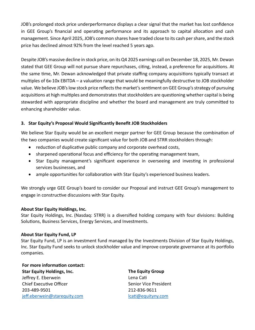 JOB’s prolonged stock price underperformance displays a clear signal that the market has lost confidence in GEE Group’s financial and operaƟng performance and its approach to capital allocaƟon and cash management. Since April 2025, JOB’s common shares have traded close to its cash per share, and the stock price has declined almost 92% from the level reached 5 years ago. Despite JOB’s massive decline in stock price, on its Q4 2025 earnings call on December 18, 2025, Mr. Dewan stated that GEE Group will not pursue share repurchases, ciƟng, instead, a preference for acquisiƟons. At the same Ɵme, Mr. Dewan acknowledged that private staffing company acquisiƟons typically transact at mulƟples of 6x-10x EBITDA – a valuaƟon range that would be meaningfully destrucƟve to JOB stockholder value. We believe JOB’s low stock price reflects the market’s senƟment on GEE Group’s strategy of pursuing acquisiƟons at high mulƟples and demonstrates that stockholders are quesƟoning whether capital is being stewarded with appropriate discipline and whether the board and management are truly commiƩed to enhancing shareholder value. 3. Star Equity’s Proposal Would Significantly Benefit JOB Stockholders We believe Star Equity would be an excellent merger partner for GEE Group because the combinaƟon of the two companies would create significant value for both JOB and STRR stockholders through: reducƟon of duplicaƟve public company and corporate overhead costs, sharpened operaƟonal focus and efficiency for the operaƟng management team, Star Equity management’s significant experience in overseeing and invesƟng in professional services businesses, and ample opportuniƟes for collaboraƟon with Star Equity’s experienced business leaders. We strongly urge GEE Group’s board to consider our Proposal and instruct GEE Group’s management to engage in construcƟve discussions with Star Equity. About Star Equity Holdings, Inc. Star Equity Holdings, Inc. (Nasdaq: STRR) is a diversified holding company with four divisions: Building SoluƟons, Business Services, Energy Services, and Investments. About Star Equity Fund, LP Star Equity Fund, LP is an investment fund managed by the Investments Division of Star Equity Holdings, Inc. Star Equity Fund seeks to unlock stockholder value and improve corporate governance at its porƞolio companies. For more informaƟon contact: Star Equity Holdings, Inc. The Equity Group Jeffrey E. Eberwein Lena CaƟ Chief ExecuƟve Officer Senior Vice President 203-489-9501 212-836-9611 jeff.eberwein@starequity.com lcaƟ@equityny.com